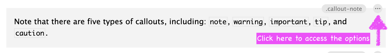 Note that there are five types of callouts, including: note, tip, warning, caution, and important.